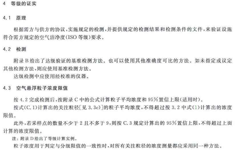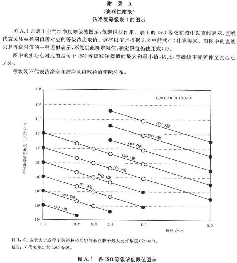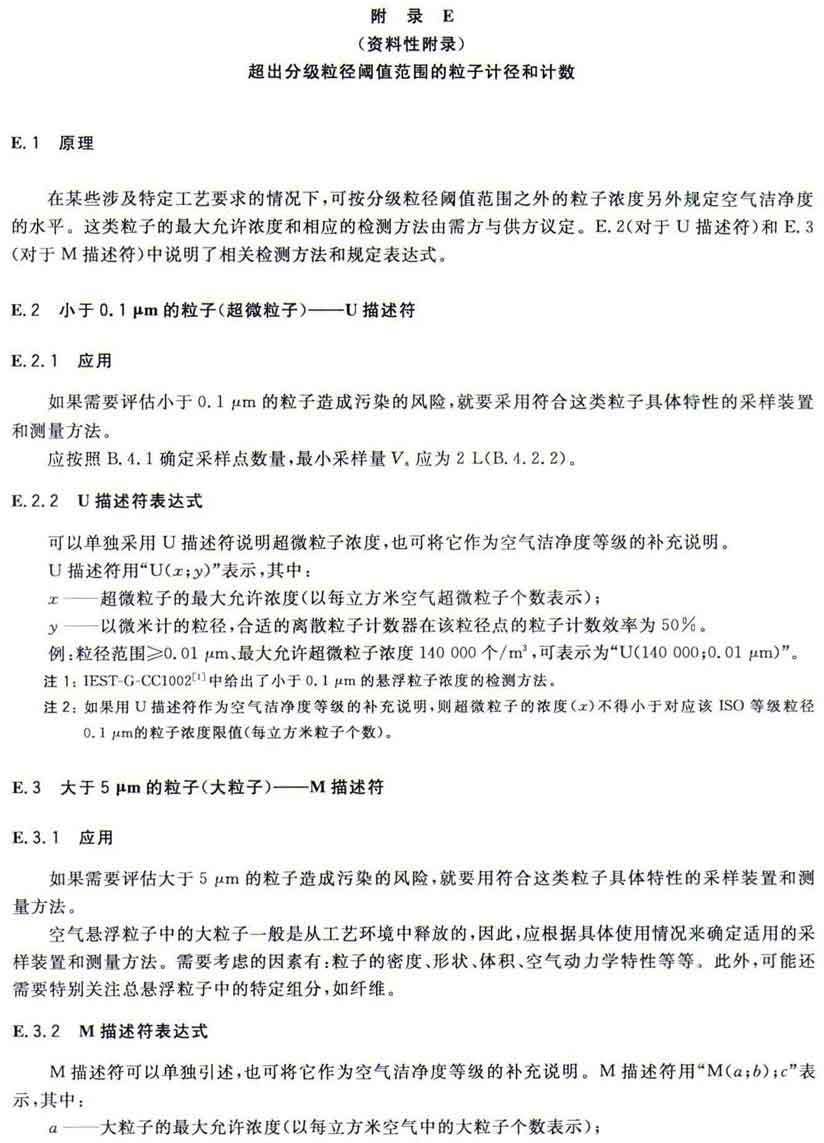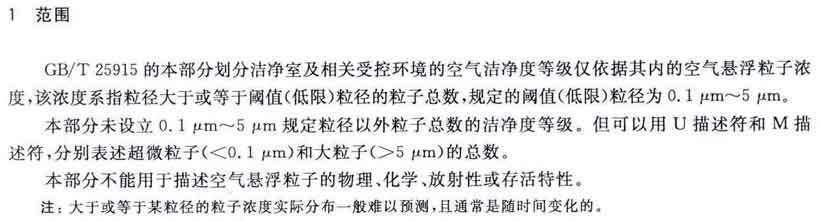 GB/T25915的本部分劃分潔凈室及相關受控環(huán)境的空氣潔凈度等級僅依據其內的空氣懸浮粒子濃度,該濃度系指粒徑大于或扥估閾值(低限)粒徑為0.1μm~5μm規(guī)定粒徑以外粒子總數的潔凈度等級。但可以用U描述符合M描述符,分別表述超微粒子(<0.1μm)和大粒子(>5μm)的總數。